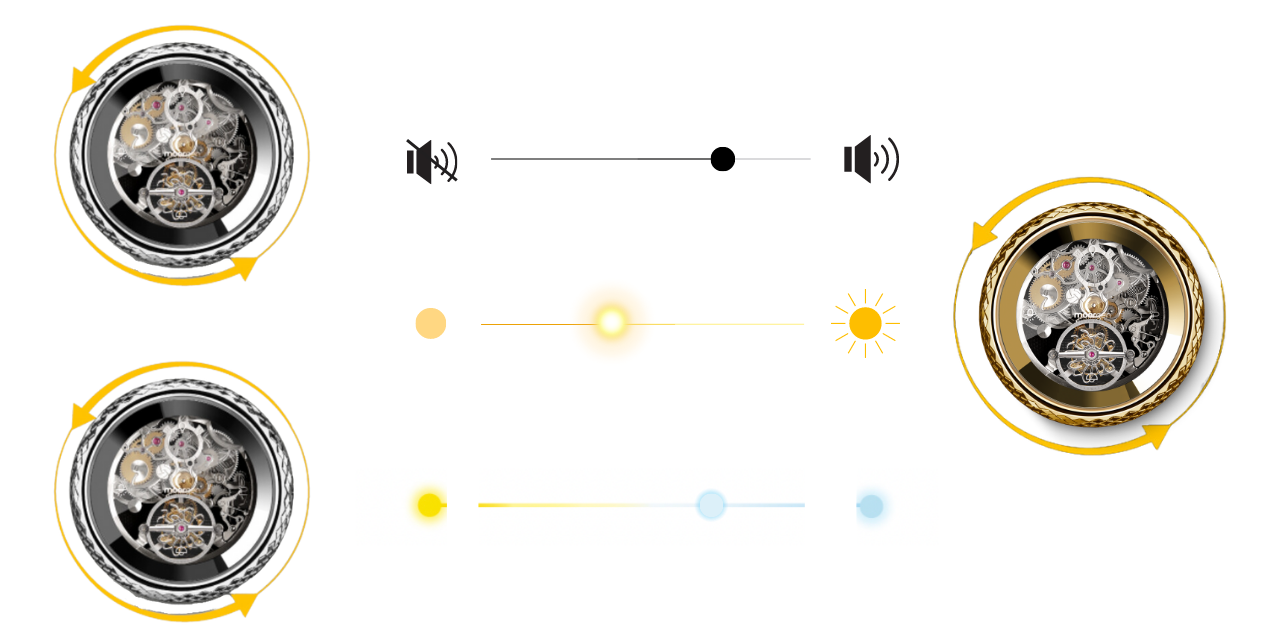 Control all 0 - 100% devices such as lights, temperature of light, sound of music, etc. by rotating the outer rim of the dimming knob, or slide on the screen.