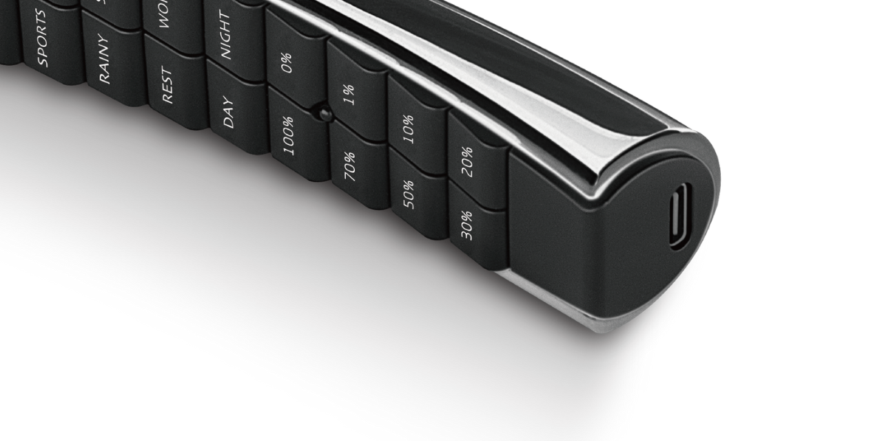 M36 智能遙控器附有高質感象牙狀彎曲底坐,可橫放於任何平面。
